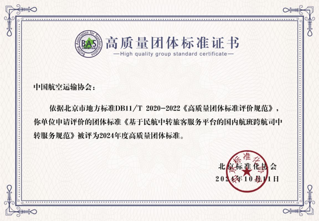 喜报!中国航空运输协会团标获评2024年高质量团体标准